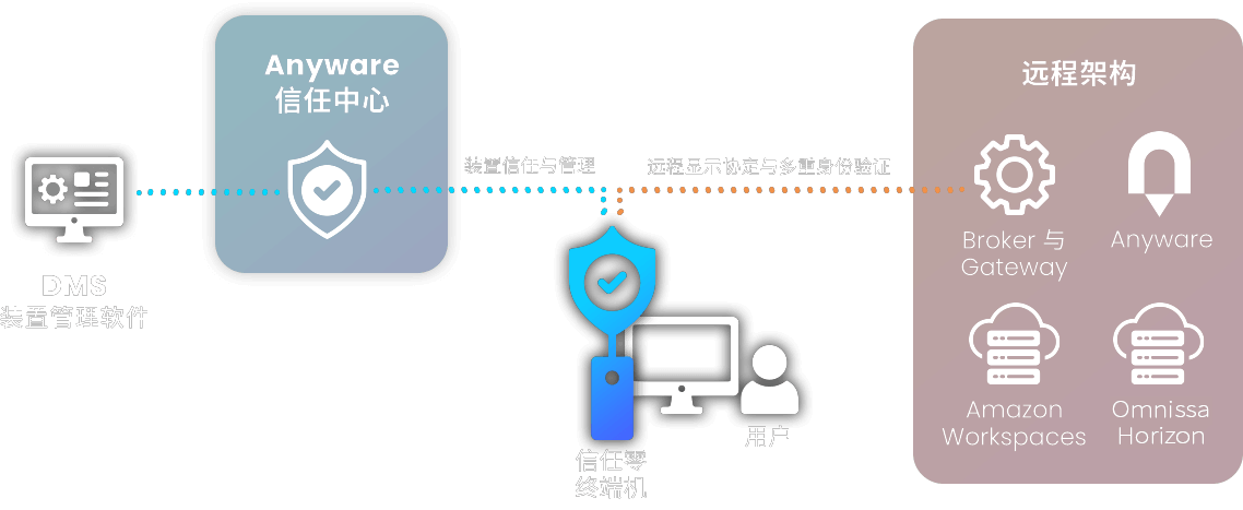 新一代信任零终端机 (Trusted Zero Client) 技术建立在 PCoIP 零终端机的坚实基础上,带来出色的远程联机安全性和 PCoIP Ultra 效能,帮助 IT 人员将零信任架构整合至其数字工作空间环境中。所有这些都透过与 Anyware 信任中心 (Anyware Trust Center) 整合的 DMS 装置管理软件来进行管控,该工具是一个零信任策略引擎,它持续验证每个存取行为,以启动安全的可信任远程联机,并为可信任装置建立安全策略。
