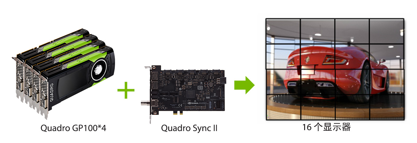 若使用2张 Quadro Sync II 卡则可同步8张GPUs 并提供高达32个屏幕输出!