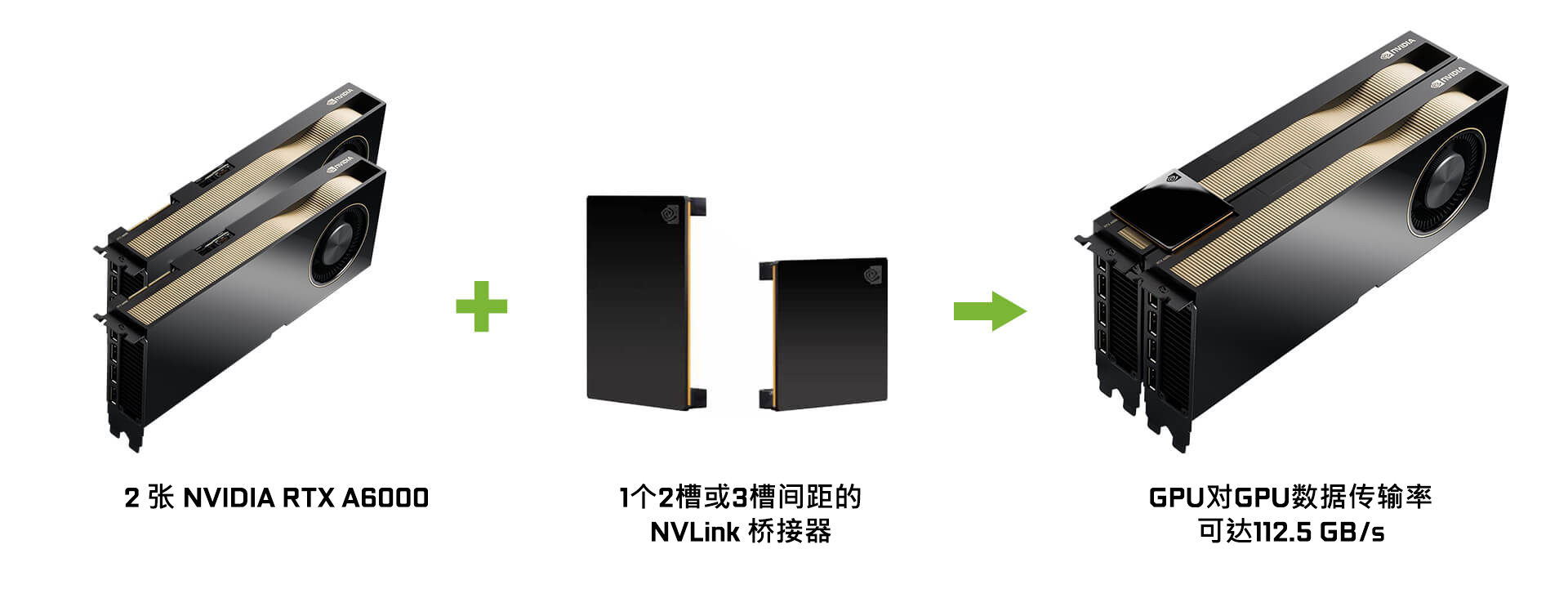 通过以高达112.5 GB / s(总带宽)的速率实现GPU到GPU的数据传输,将两张RTX A6000卡与NVLink相连,可以有效将内存空间增加一倍,并扩展应用程序效能。