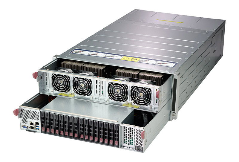 该系统⽀持 8 个 Tesla SXM2 V100 GPU,这些 GPU 安装在 GPU 主板附加模块上,该模块通过中面板连接到主板。GPU 主板透过 Nvidia 的 Cube Mesh NVLINK 架构连接。所有 GPU 之间的直接连接是单个 NVlink(25 GB/s)。可以从 PCI-E PLX 交换机到前端的 PCI-E3.0 x16 提供从 GPU 到网络的直接连接。每个 PCI-E PLX 交换机都是两个 SXM2 模块和一个 PCI-E3.0 x16 插槽的根。安装在转接卡上的快速网络(扩展)卡可以提供很高的速度。数据可以从 GPU 到 PLX 再到 NIC,而无需通过 CPU。对于 NIC,系统可以同时支持 FDR 和 EDR (在 x16 插槽中)。