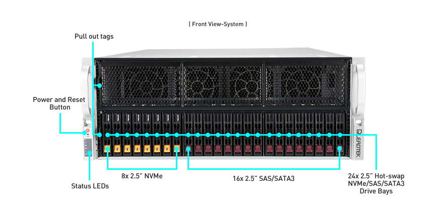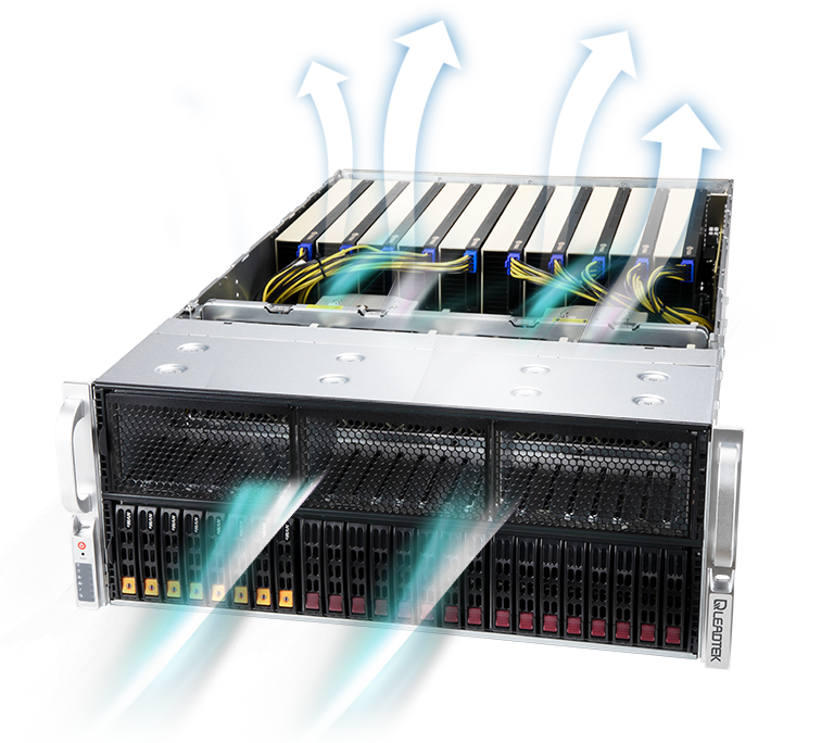 WinFast GS4850T 可支持多达 10 个双插槽 GPU 的高性能服务器, 可以支持 NVIDIA GPU, 包括 A40/A30/A10/A6000 并可以搭配 NVLink 桥接器, 扩展多 GPU 的计算性能, 符合 AI 深度学习/ 3D 绘图/模拟等应用的需求。