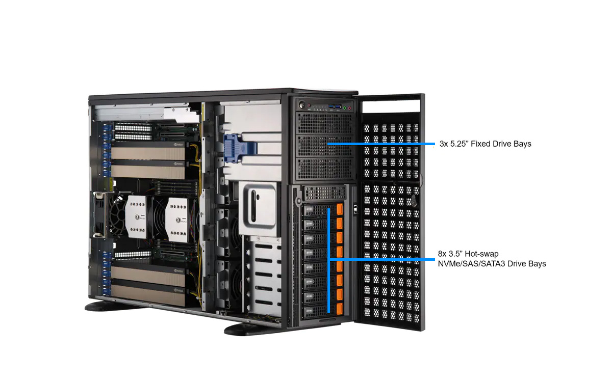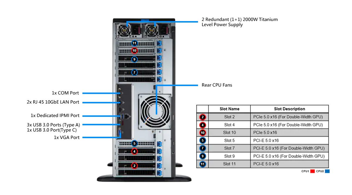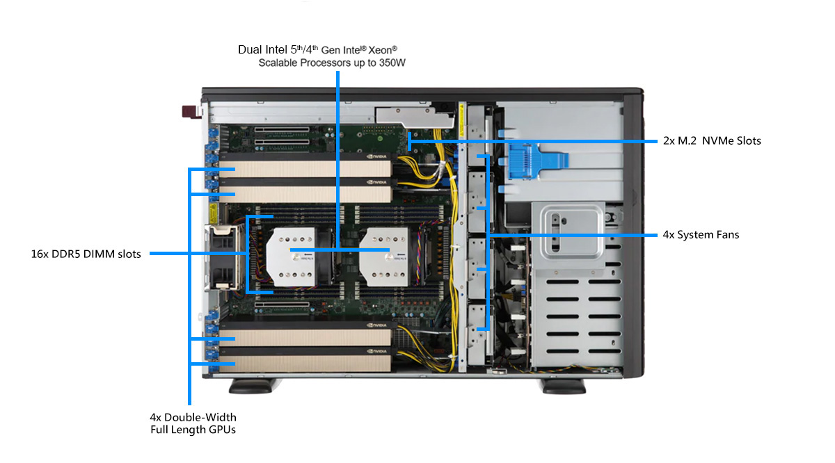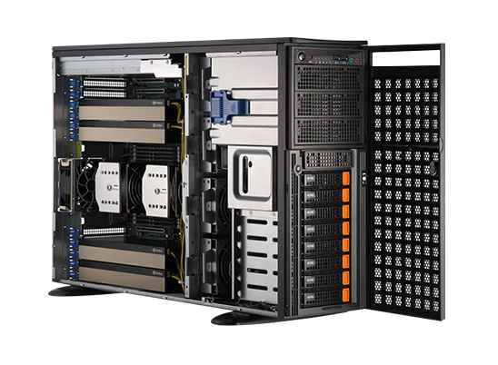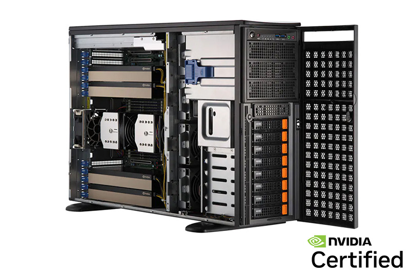 WinFast WS2050 可支持多达 4 个双插槽 GPU 的超级工作站, 可以支持 NVIDIA Ada Lovelace / Ampere 架构的 GPU, 扩展多 GPU 的计算性能, 符合 AI 深度学习/ 3D 绘图/模拟等应用的需求。