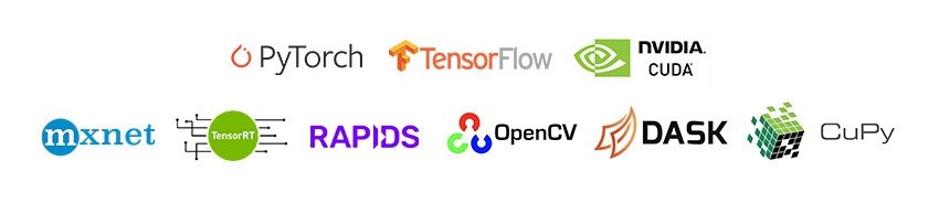 RTX AI框架 Chainer、TensorFlow、PyTorch、NVIDIA DIGITS、NVIDIA CUDA、NVIDIA Caffe、 NVIDIA MxNet、NVIDIA PyTorch、NVIDIA TensorFlow、NVIDIA TensorRT、NVIDIA TensorRT Server、NVIDIA RAPIDS