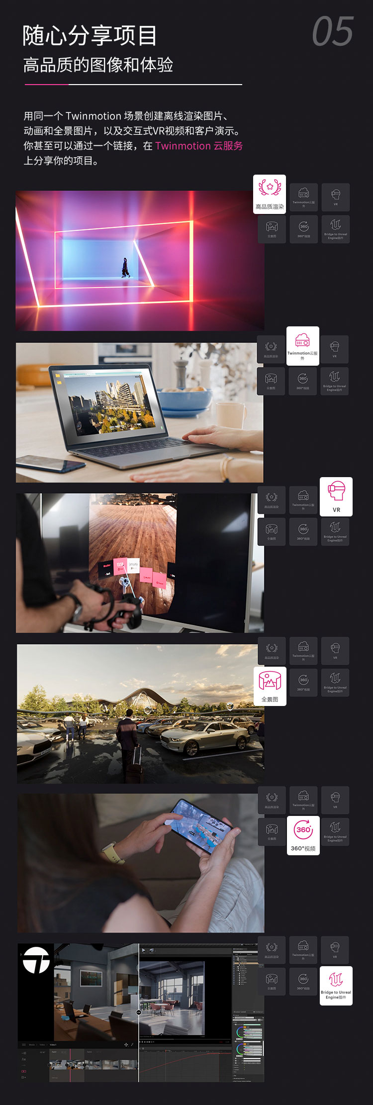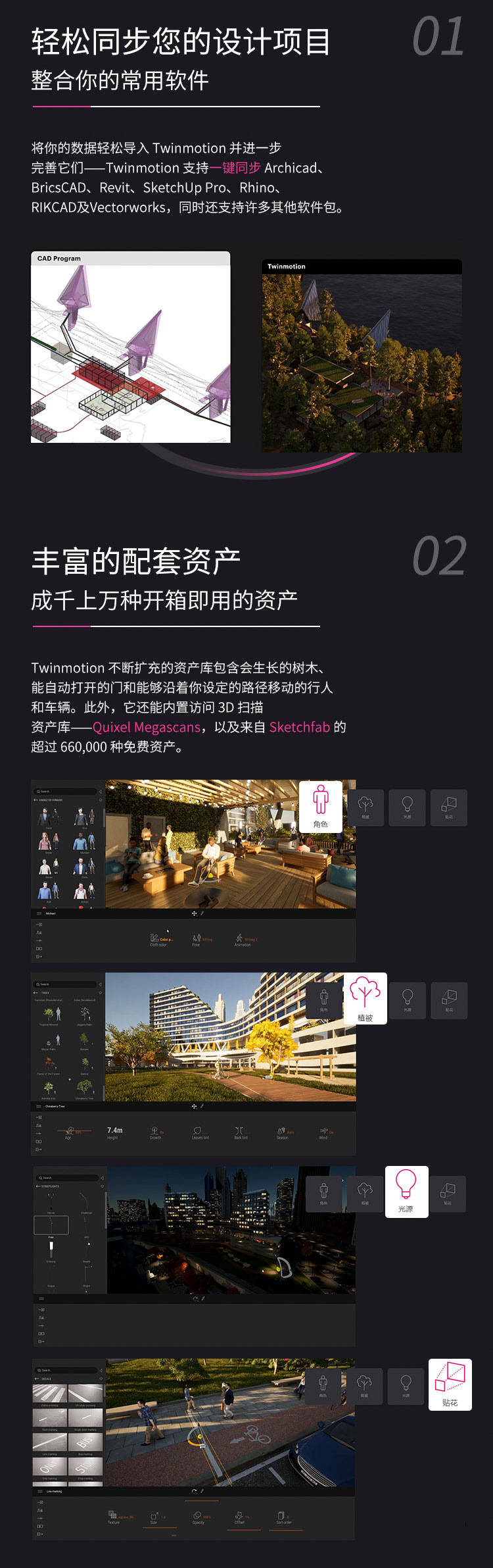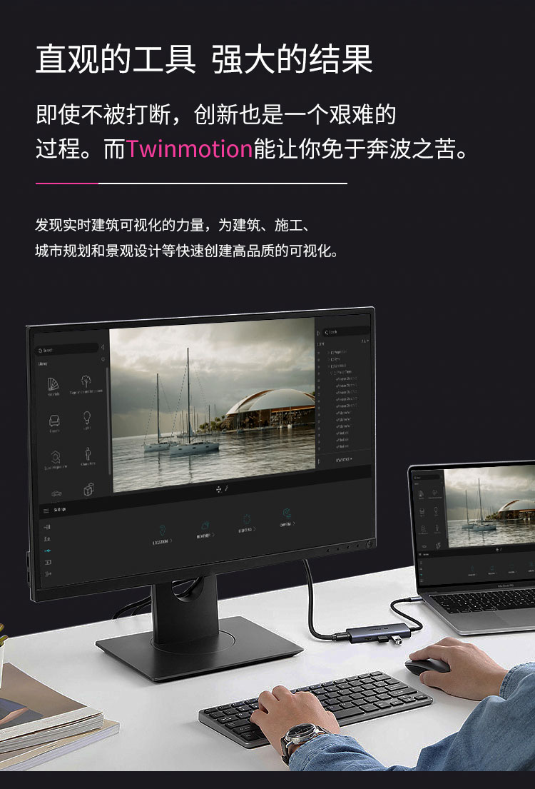Twinmotion 是一款专为建筑需求而设计的即时可视化工具,它非常方便灵活,能够完全集成到AEC行业的工作流程中。 作为一款解决方案,Twinmotion结合了直观的图标式界面和虚幻引擎的力量,更适合建筑、工程、施工城市规划、景观及影视动画等领域的专业人士。