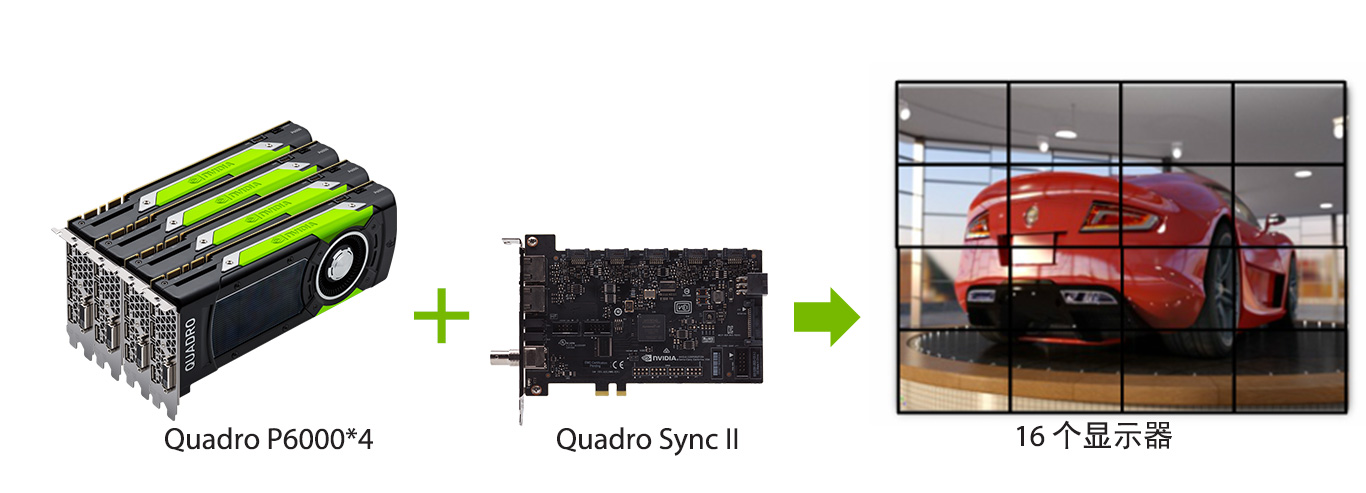 若使用2张 Quadro Sync II 卡则可同步8张GPUs 并提供高达32个屏幕输出!
