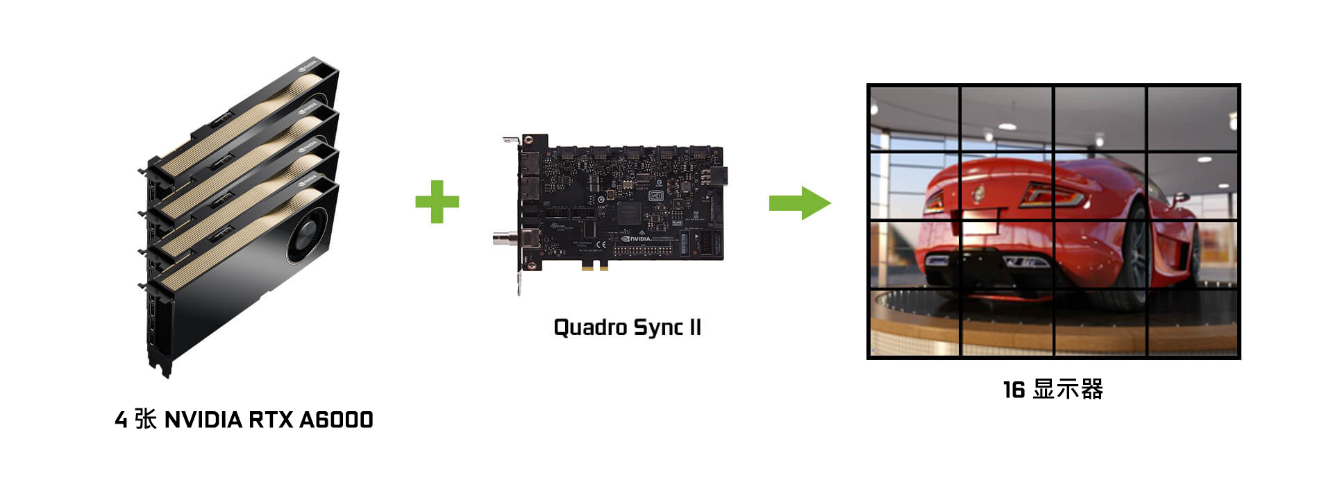 在单一系统的 8 个 GPU 中同步最多 32 个显示器的显示和画面输出 (透过两张 Sync II 适配卡连接),减少建立高阶影像可视化环境所需的机器数量。