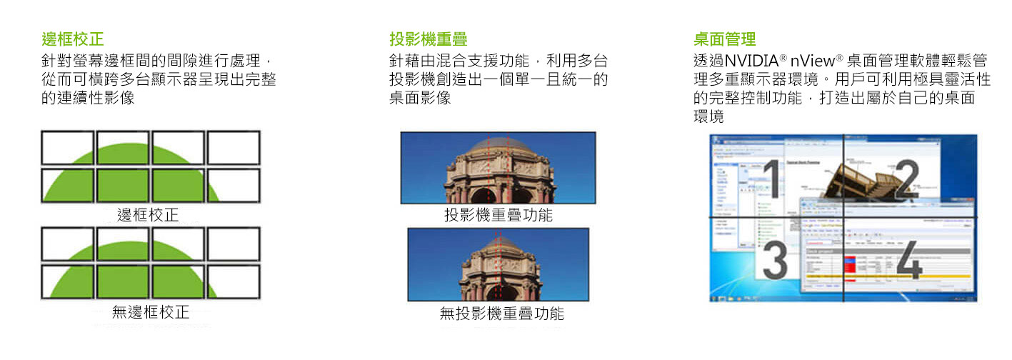 從單一工作站跨多達4個GPU和16台顯示器,無障礙地擴展桌面和應用軟體,同時提供全面的性能和影像質量,並針對靜態圖像可視化和統一桌面進行優化