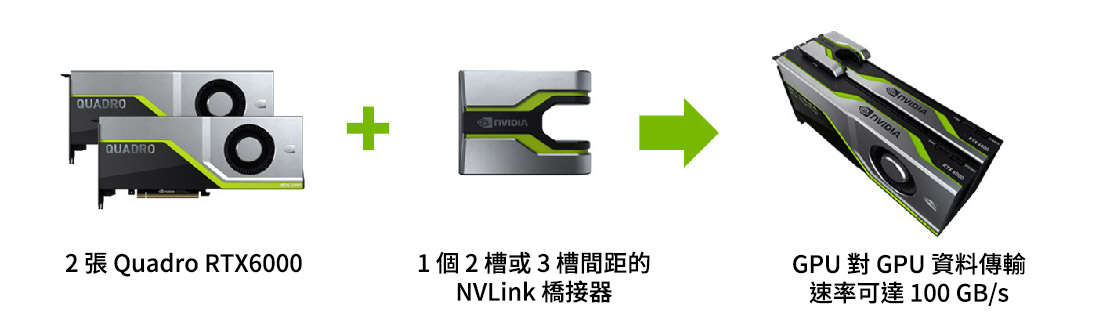 用 NVLink 連接兩張 Quadro RTX 5000 將有效可用記憶體加倍,並可利用高達 25GB/s (雙向) 的 GPU 對 GPU 資料傳輸率將應用程式效能擴張 ,總頻寬可達 50 GB/s。