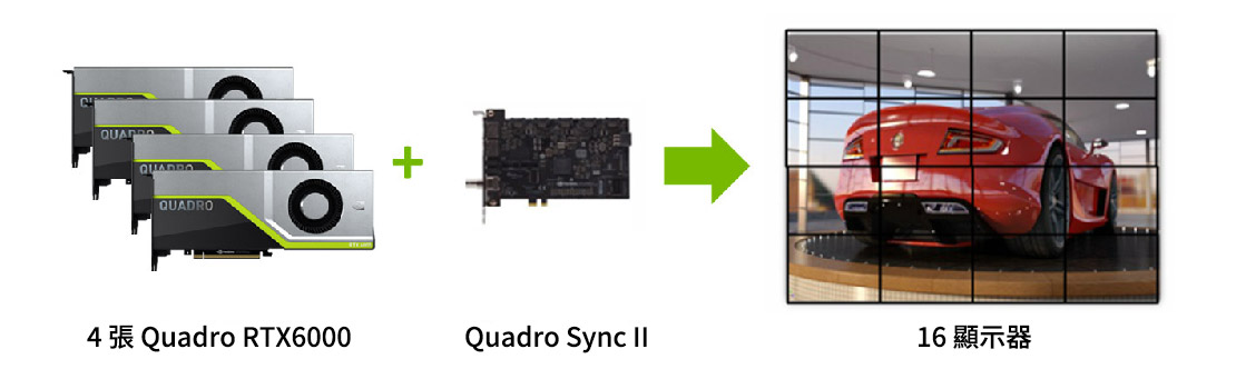 在單一系統的 8 個 GPU 中同步最多 32 個顯示器的顯示和畫面輸出 (透過兩張 Sync II 介面卡連接),減少建立高階影像可視化環境所需的機器數量。