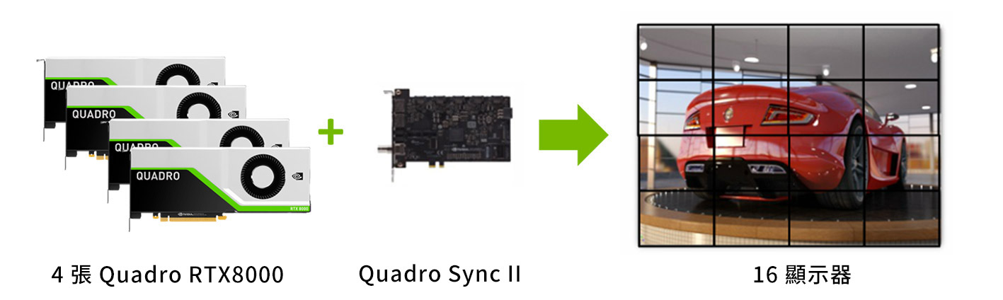 在單一系統的 8 個 GPU 中同步最多 32 個顯示器的顯示和畫面輸出 (透過兩張 Sync II 介面卡連接),減少建立高階影像可視化環境所需的機器數量。