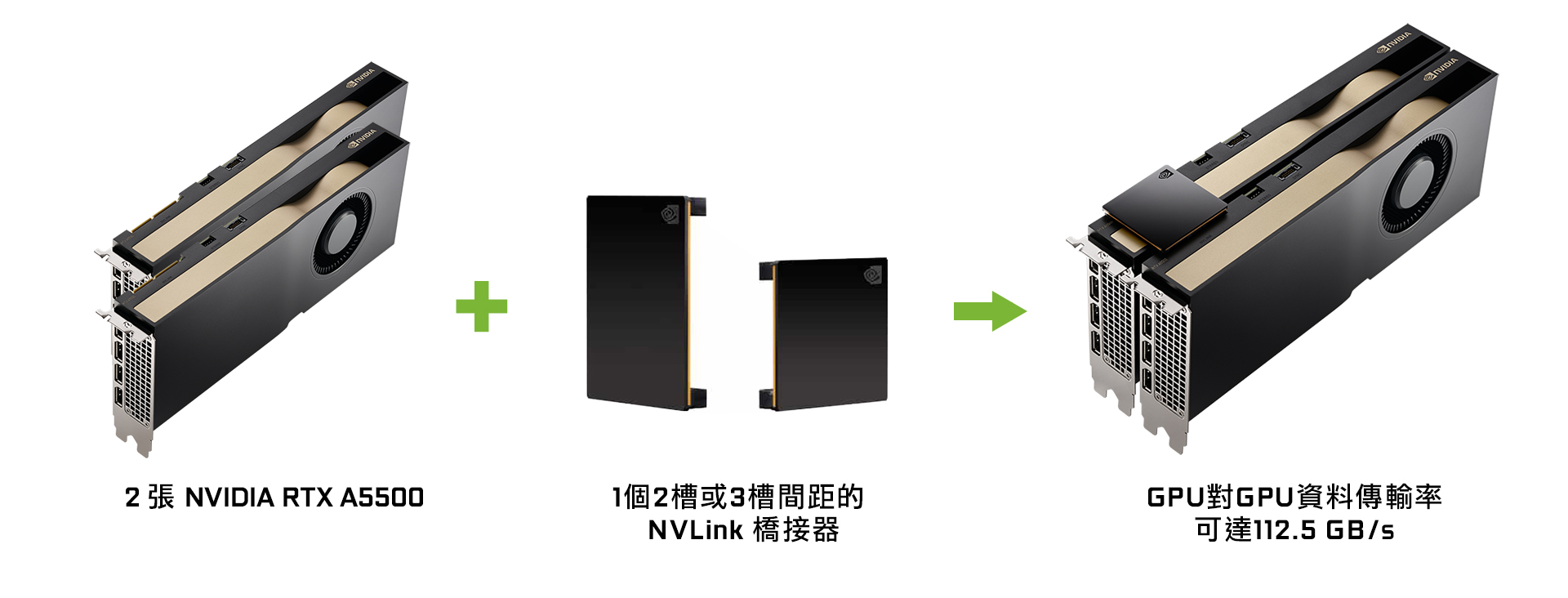 | NVLink | 2-槽位/3-槽位 橋接器 可連接兩張 RTX A5500 |