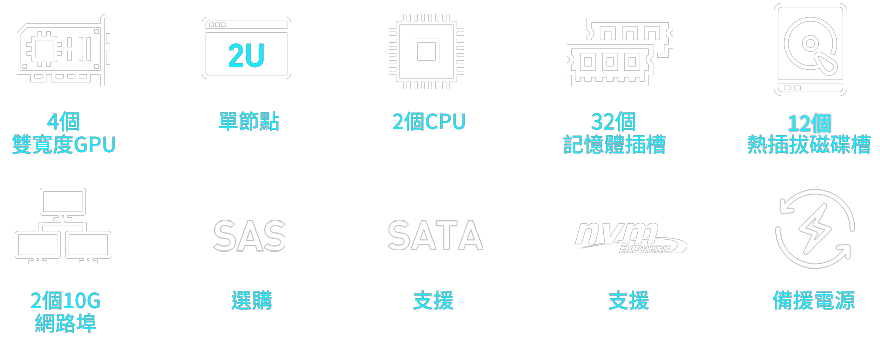 | 熱插拔 | 12x 3.5”/2.5” hot-swap NVMe/SATA/SAS drive bays |
