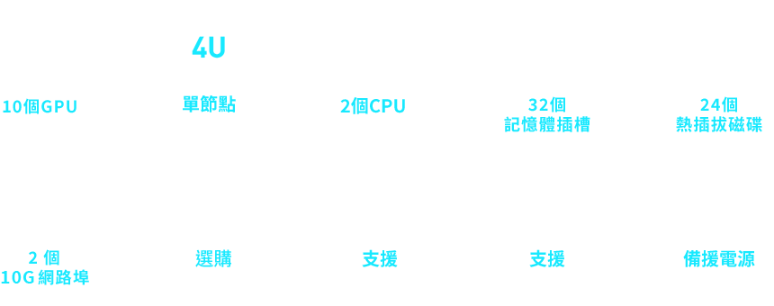 WinFast GS4850T 可支援多達 10 個雙寬度GPU的高效能伺服器, 可以支援 NVIDIA GPU, 包括 H100/A100/A40/A30/A10/A6000/6000 Ada 並可以搭配 NVLink 橋接器, 擴展多 GPU的運算效能, 符合 AI 深度學習/3D繪圖/模擬等應用的需求。