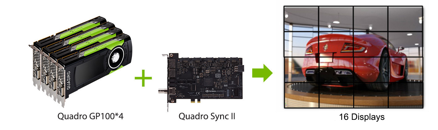 Support Quadro Sync IISynchronize the display and image output of up to 32 displays from 8 GPUs (connected through two Sync II boards) in a single system, reducing the number of machines needed to create an advanced video visualization environment.
