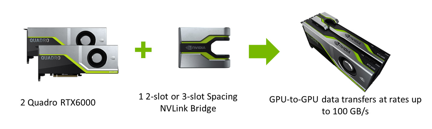 Connect a pair of Quadro RTX 6000 cards with NVLink to double the effective memory footprint and scale application performance by enabling GPU-to-GPU data transfers at rates up to 100 GB/s (total bidirectional bandwidth).