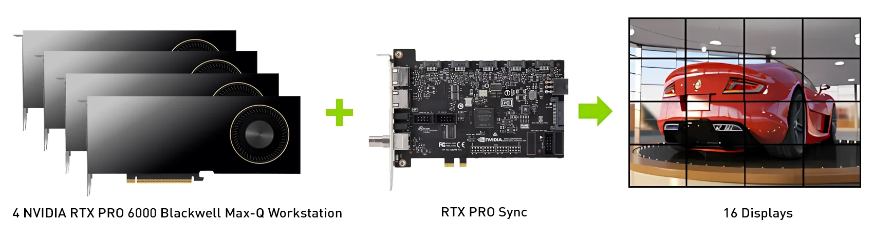 Two RTX PRO Sync cards can be connected to synchronized up to 8 RTX PRO or RTX GPUs per system to provide up to 32 synchronized displays.